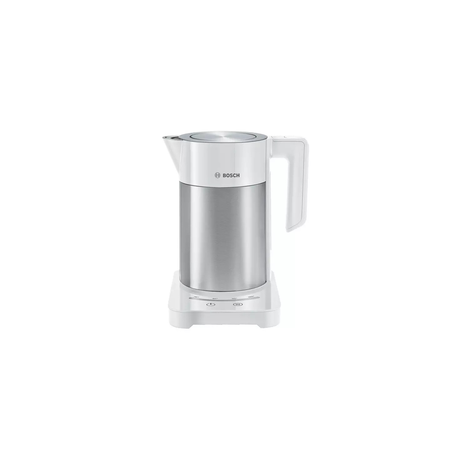 Control your water temperature precisely with the Bosch TWK7201GB Sky Variable Temperature Electric Kettle in sleek white. The innovative touch panel lets you adjust heat in 5 degree C intervals using the futuristic slider control, which displays real-time temperature as the water heats. For delicate teas and instant coffee alike, this adjustable temperature kettle boils up to 1.7 L quickly with high 3000W power and keeps water at your chosen temperature for 30 minutes.