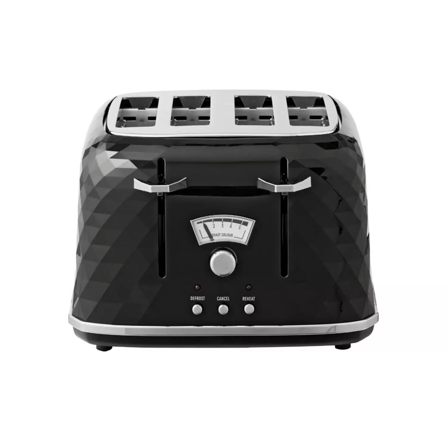 Add a touch of style to your kitchen with this De’Longhi Brillante 4 slot toaster – uniquely textured and designed, with multi-faceted high gloss finishing and chrome details. This toaster offers a host of options including rapid toasting, defrost, reheat and variable browning functions. The extra lift makes it easier to get toast out if needed. The deep crumb tray will keep your kitchen surface tidy.